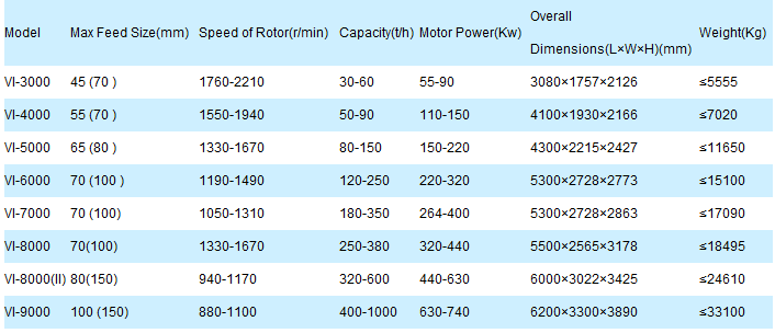 Material falls down into high rolling impeller cavity vertically through the upper part of machine. Under great centrifugal force, it hits and crushes another part of material that distributing around the impeller with umbrella form. After hitting each other, they force a vortex between impeller and shell, and hit each other several times; finally smaller stone comes out, and goes to vibrating screen. Satisfactory material is transported by conveyor belt. However overlarge material will go back to VSI Series Vertical Shaft Impact Crushers to be re-crushed. Otherwise, output sizes can be also adjusted according to customer's requirement.VSI Series Vertical Shaft Impact Crushers,sand maker,impact crushers Technical Data