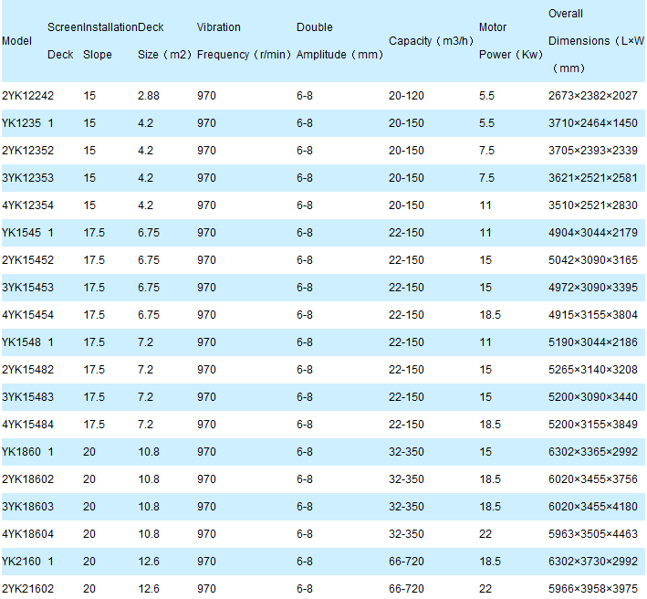 YK Series Inclined Vibrating Screens Features and Benefits:1. High vibrating force with unique eccentric structure. Adopt advanced construction, making the vibrating force powerful.2. The beam and case of the screen are connected with high strength bolts without welding.3. Simple structure, easy to repair.4. Adopt tire coupling and soft connection makes operation smooth.5. High efficiency, easy maintenance, sturdy and durable.Usage and Maintenance:Inclined Vibrating Screen should start when there is nothing on the screen surface, and should avoid start the machine with materials, when the material running steady, then can feed. Stop feeding before stop the machine, and keep there is no material on the surface then stop the machine. Observe the operation of the machine when it is running. If there are abnormal movement or unusual sound, we should stop the machine and examine it, find the causes, and eliminate the troubles.