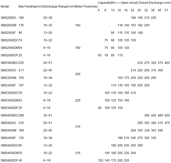 SMS Series Hydraulic Cone Crusher OverviewSMS Series Hydraulic Cone Crusher is new crushing machine with high performance. It is suitable for hard and medium hard rocks and ores.It has noable and special features with Fixed main shaft,Modified insurance cylinder, accumulator,Clear cavity,Locking the adjusting ring,Hydraulic adjusting the discharge opening,Integration base,Optimized cavity, higher capacity,etc.It is widely used in Metallurgical, aggregate, building material industries,etc.SMS Series Hydraulic Cone Crusher can crush Iron ore,copper ore,slag,pebbles,quartz,granite,basalt,diabase,etc.