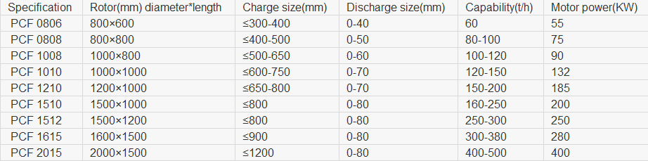 Rotor disk, driven under the motor, drive the hammerhead to do high-speed circular motion. Materials are carried into machine from the upper feeding inlet, crushing by the strike, impact, bump, and grind of the high-speed running hammerhead. After crushing, those materials with larger granularity than requirement hit the counterattack board for re-crush along the hammer tangent direction with the new materials, so that the coarse, medium and fine crushing all in one station, finally materials meeting requirement exclude from material outlet.PCF series Heavy Hammer Crusher set stone crushing and shape as a whole, with big feeding granularity and small outgoing granularity. It has advantages of large reduction ratio, great production, particles shapeliness, simple structure, easy maintenance. Comparing with the same type produces, it has larger production and higher qualified rate, shapeliness particles, lower energy consumption.