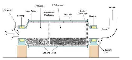 The ball mill has horizontal cylindric rotating device, outer rotating with gear, two warehouses, is lattice-type ball mill. Material from the feeder device throuth hollow shaft of feeder evenly into the first warehouse of ball mill , there are ladder liner and ripple liner in the warehouse , built by steel ball with different specifications , rotating cylinder produces centrifugal force take the ball to a certain height then fall,have a impact of the thumping and grinding for the material. After the material in the first warehouse reach coarse grinding,pass throuth single-wall partition into the second position, the warehouse lined with flat lining and steel balls in it ,have further grinding for the material . Powder discharged through the discharging plate to complete the grinding operation.
